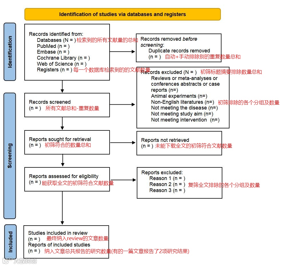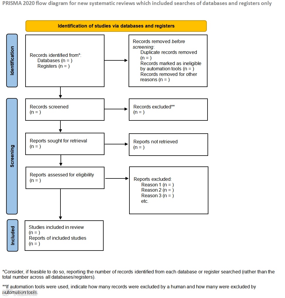 下面我们展示一下更适用于平常使用的改良版的flow diagram以及对每一个填写框进行解释(原版中有*以及**注释,*如果可行,考虑报告从每个数据库或登记册中确定的记录数量(而不是所有数据库/登记册中的总数;**如果使用了自动化工具,请说明有多少条记录被人工排除,有多少条记录被自动化工具排除。我们直接按要求进行了报告,所以图片下不再展示*以及**)。