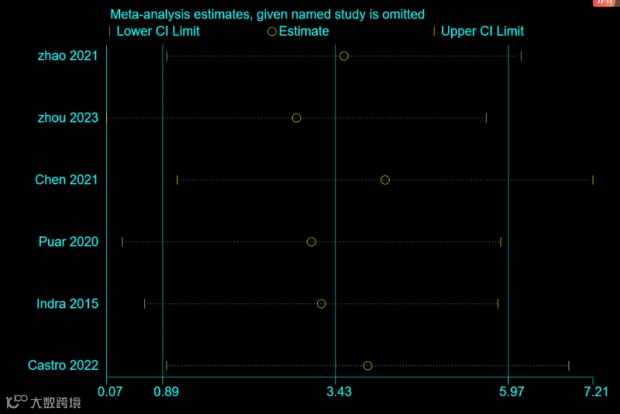 敏感性分析(Sensitivity Analysis)就是在问这样一个问题:“如果我把某些研究拿掉,结果还一样吗?”换句话说,它是在检验我们的结论是否稳健(robust)。如果删掉某个研究,合并效应值(如OR、RR、SMD)变化不大,那就说明结果稳定;反之,如果删掉某个研究,结果立刻翻转或变化明显,那就说明这个研究对整体结果敏感,也意味着整体结论可能不够稳健。
