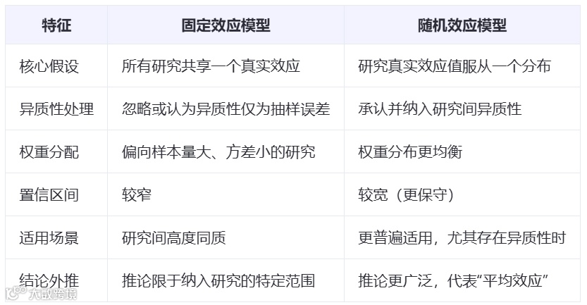 固定效应模型假设所有研究共享一个共同的真实效应,研究间的差异仅由抽样误差导致。而随机效应模型则认为真实效应在不同研究间存在变异,研究间的差异既包括抽样误差,也包括真实效应的差异。