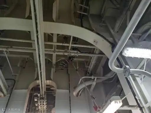 进入CO2间前按规定进行通风、测试并办理进入许可。此前钢瓶连接管已更换,但因管路弯曲导致相邻钢瓶管道紧贴,存在船舶震动时摩擦风险,已在上一次RS检查中被提出,需择机整改[k]。