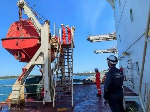 随后检查救生艇与救生筏。救生艇外观、备品、应急灯、启动停机、正倒车及舵效测试均正常。针对高龄船舶舵杆易锈蚀脱落的问题,强调需加强日常保养。救生筏主要检查静水压力释放器及绑扎情况,公司明令禁止使用带外皮钢丝绳。艇甲板应急灯为检查重点之一[k]。