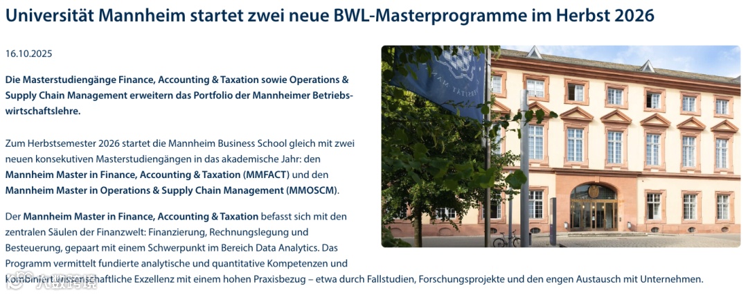 德国的曼海姆大学再次传来重磅消息——这所被誉为“欧洲商科界的哈佛”的顶尖学府,宣布将于 2026 年秋季学期正式推出两大全新硕士项目:金融、会计与税务硕士(Mannheim Master in Finance, Accounting, and Taxation, MMFACT),以及运营与供应链管理硕士(Mannheim Master in Operations and Supply Chain Management, MMOSCM)。