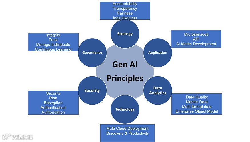 下图描述了生成式人工智能原则,分为战略、应用、数据分析、技术、安全和治理。