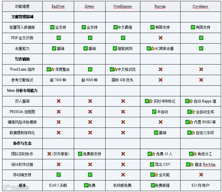 下面介绍几款常用的 Meta 分析中用于文献管理与筛选的软件工具,并进行功能对比和应用场景分析: