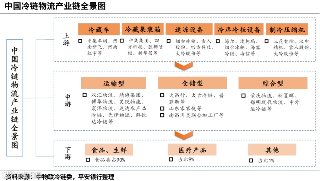 冷链物流产业链分为上游基础设施、中游服务企业与下游应用领域三大环节。上游涵盖冷藏车、冷藏集装箱及制冷设备制造商;中游包括运输型、仓储型、综合型冷链企业;下游主要应用于食品、医药及其他行业[k]。