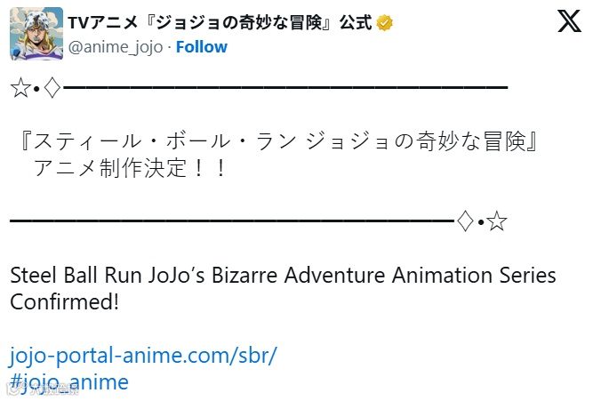 在粉丝多年等待后,动画公司David Production于备受期待的JOJO DAY庆典上正式确认,《JOJO的奇妙冒险 飙马野郎》(Steel Ball Run)动画制作启动。