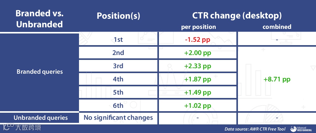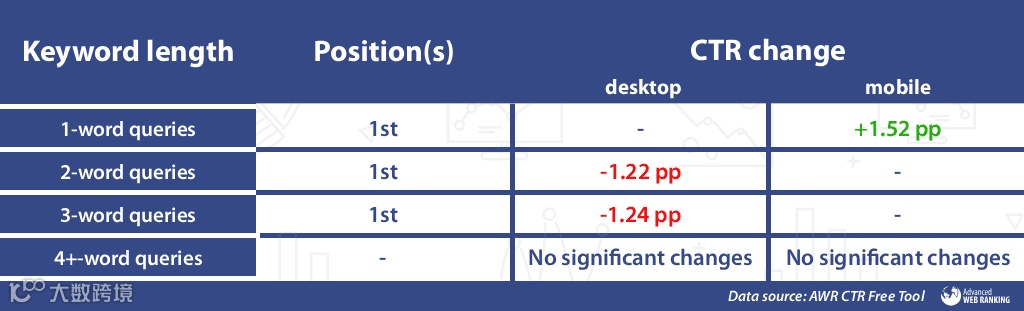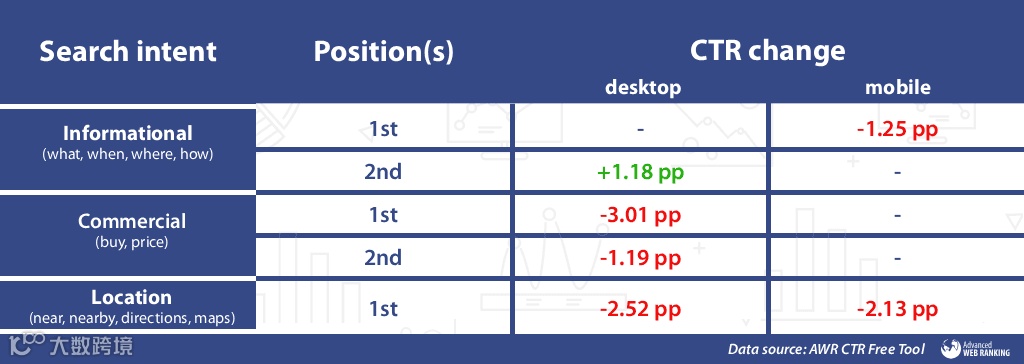 数据显示,商业查询前两位网站在桌面端总点击率下降4.20个百分点;本地查询CTR跌幅创下新高,桌面端下降2.52,移动端下降2.13。