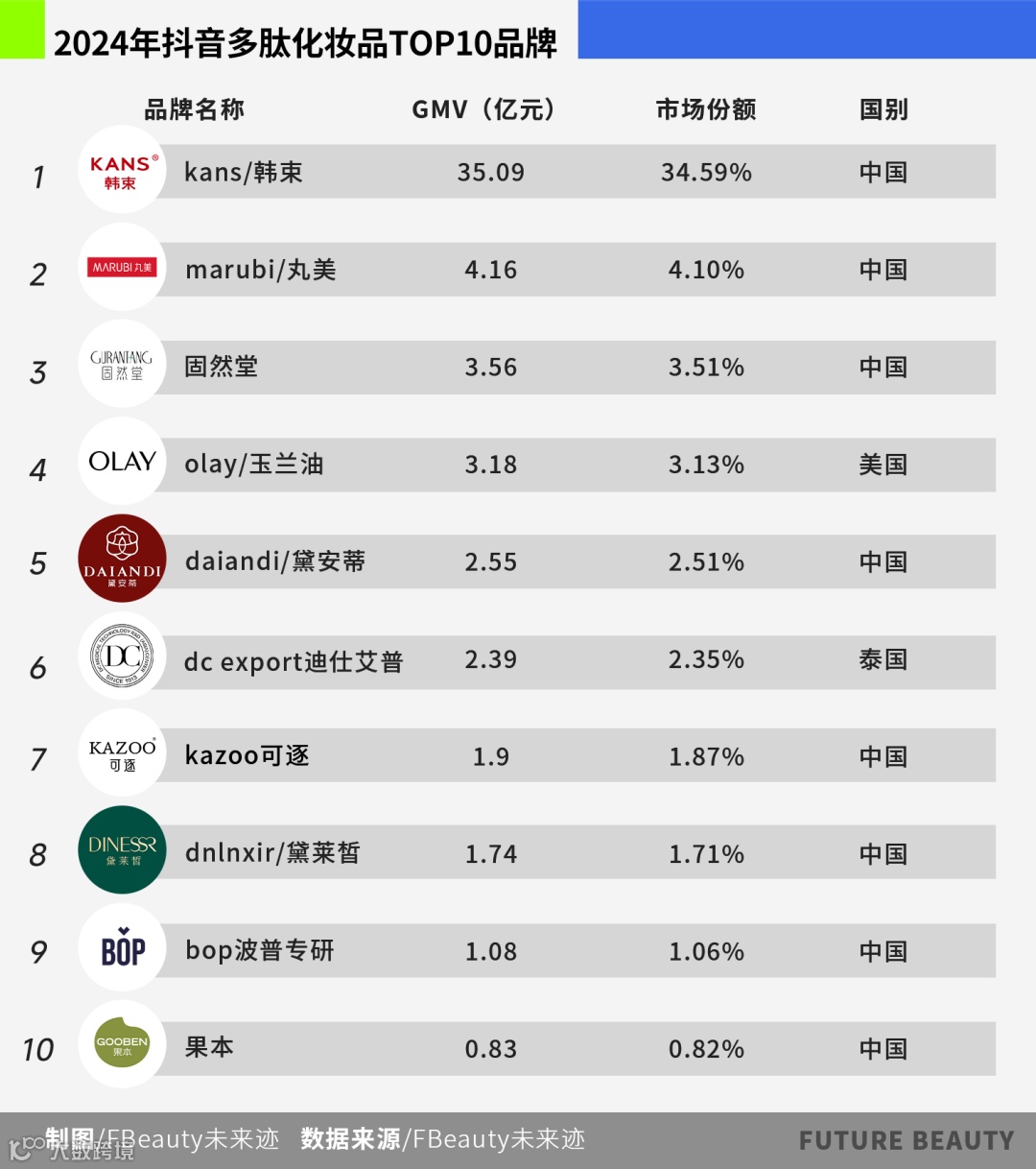 以抖音平台为例,按宣称“肽”为核心成分的产品GMV统计,2024年韩束市场份额达34.59%,远超第二名(4.1%)。Top10品牌中有8个为中国品牌,凸显国产品牌在该领域的绝对主导地位。