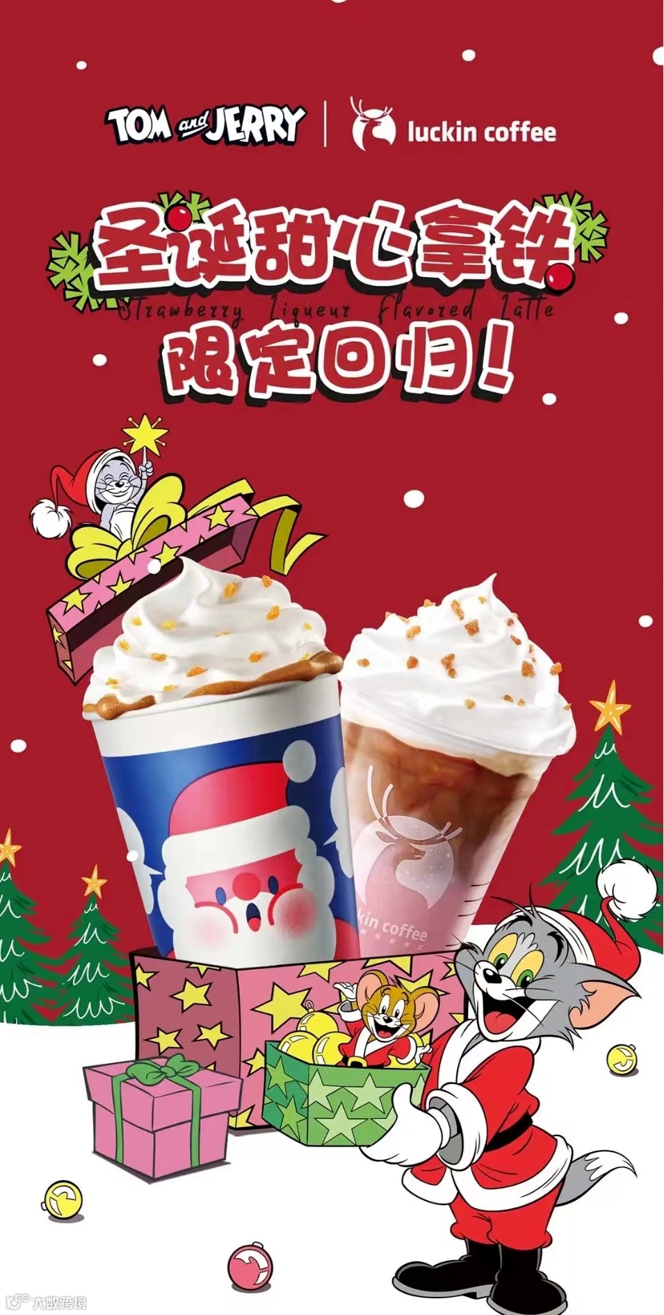 在跨界营销上已经得心应手的瑞幸咖啡,不会放过任何一个可以“搞事情”的节日。最近,瑞幸宣布和“TOM and JERRY”再次联名,推出联名新品“圣诞甜心拿铁”。这次没有联名纸杯,但杯套上印有圣诞树、猫和老鼠等元素。与“圣诞甜心拿铁”同时推出的还有另外3款饮品以及3款甜品。
