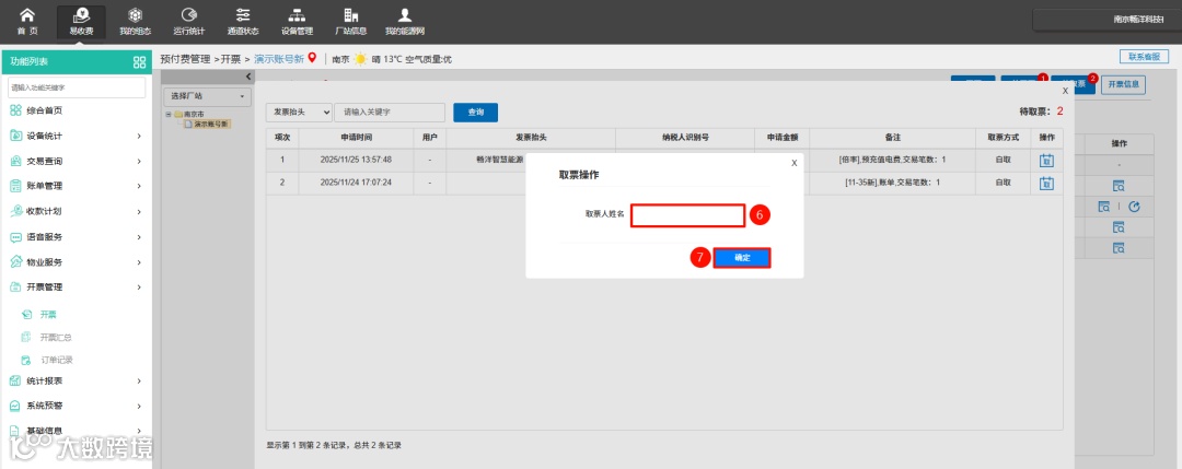方法2:易收费→开票管理→开票→待取票→取票→输入取票人姓名→确定