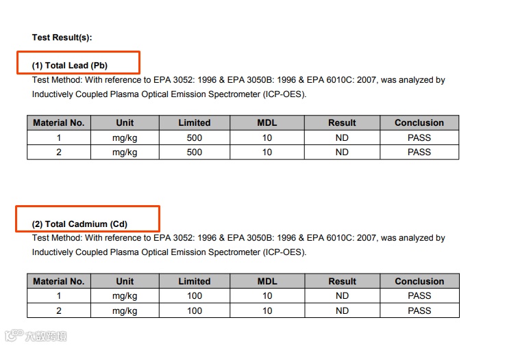 3、应进行镉含量(总镉含量)测试Cadmium content (total Cadmium content) test