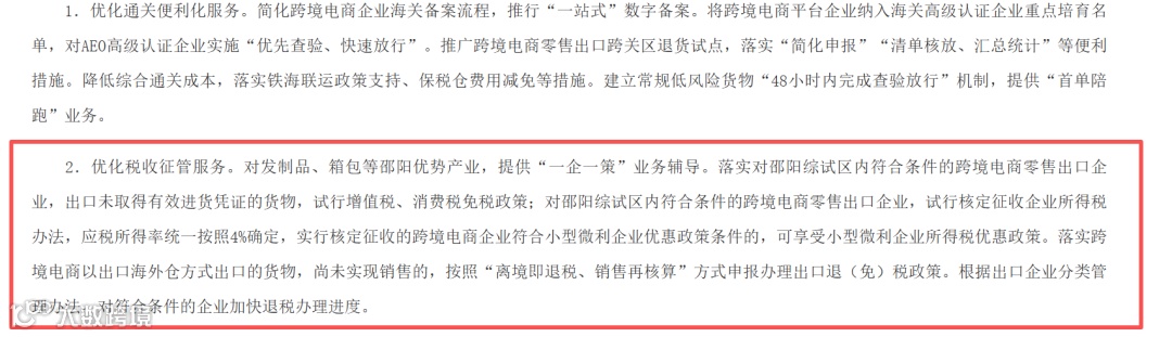 近日,《中国(邵阳)跨境电子商务综合试验区实施方案》正式发布,推出三项税收优惠措施。一是试行“无票免税”,对符合条件的跨境电商企业,出口未取得有效进货凭证的货物,可享受增值税、消费税免税政策;二是实行核定征收,统一按4%应税所得率核定征收企业所得税;三是推行“离境即退税”,以海外仓模式出口的货物,在离境后尚未销售的情况下即可提前办理退税。
