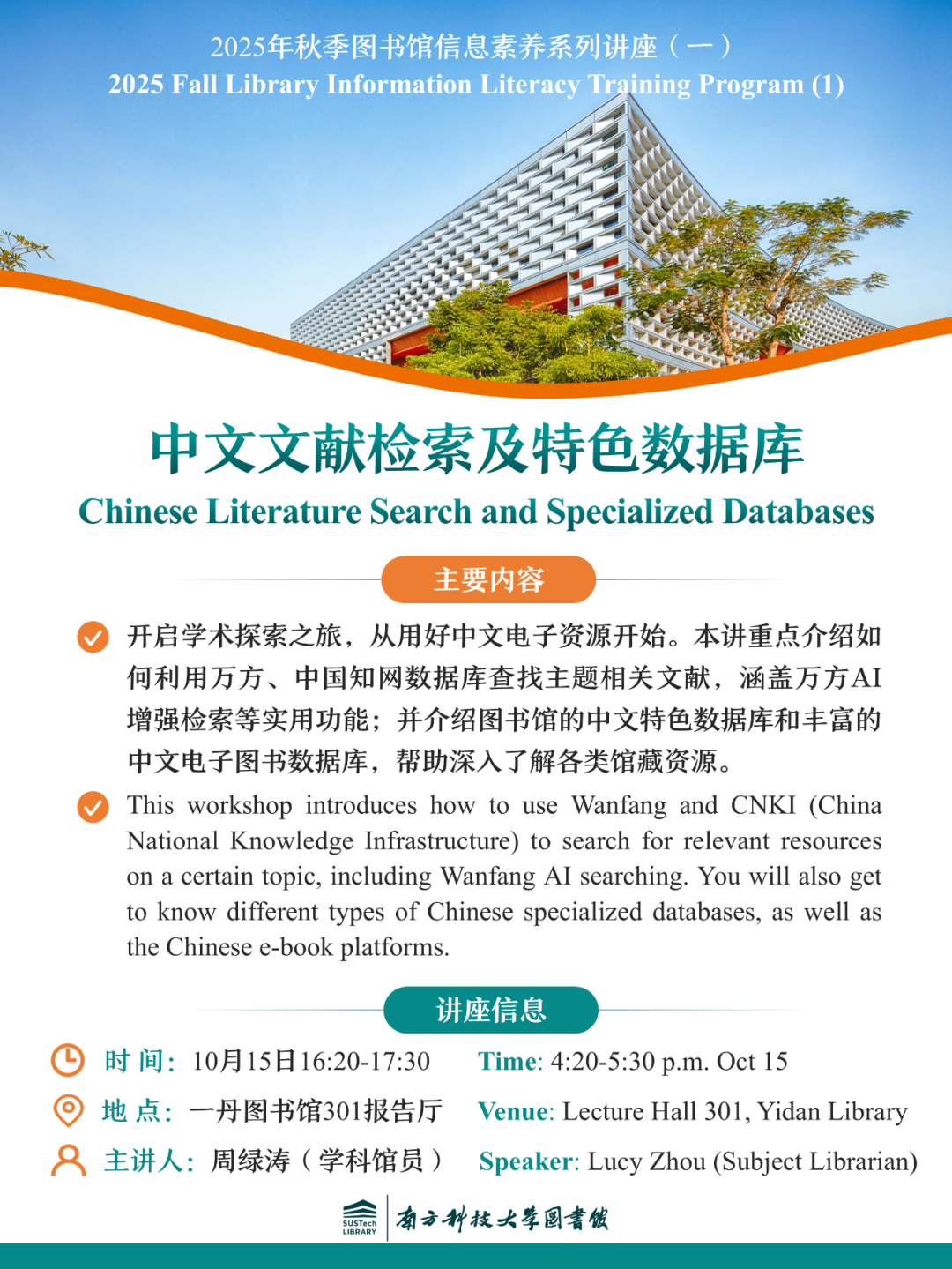 开启学术探索之旅,从用好中文电子资源开始。本讲重点介绍如何利用万方、中国知网数据库查找主题相关文献,涵盖万方AI增强检索等实用功能;并介绍图书馆的中文特色数据库,以及丰富的中文电子图书数据库,帮助深入了解各类馆藏资源。