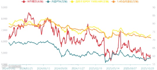 图3 2024年以来国际油价、PTA、涤纶POY、涤纶短纤价格走势