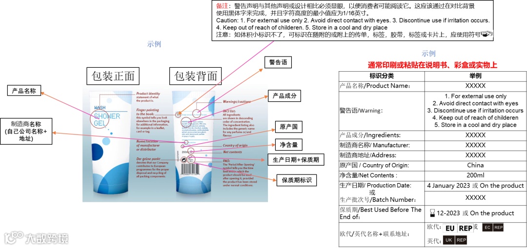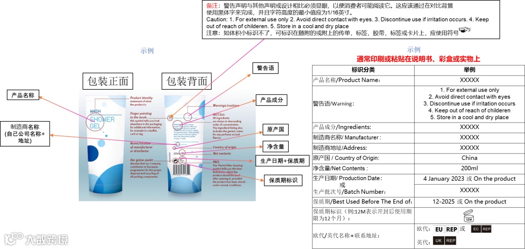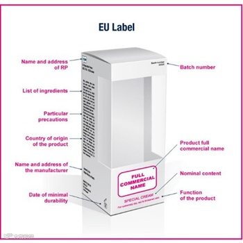 其他信息通常必须与成分表同时出现在容器和包装上。如果批次代码不能同时出现在容器上,则只能在包装上体现。同样,在有实际限制的情况下,使用条件可出现在产品随附或附在产品上的传单,标签,胶带或卡片上,并再次带有指示消费者的指示。