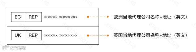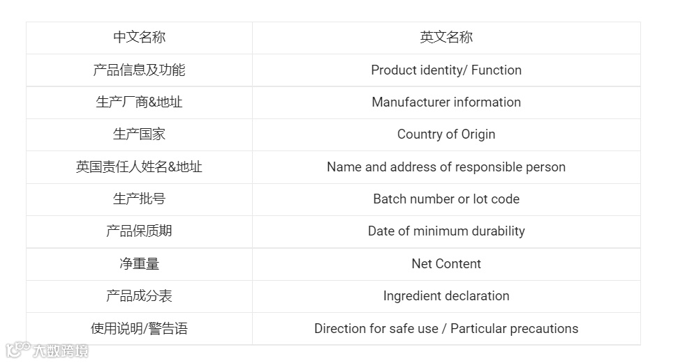 自2021年1月1日起,两年的过渡期之内,英国负责人的姓名和地址必须加贴在容器(例如管,瓶或广口瓶)和包装(例如盒子或外箱)上。如果产品在英国境外制造,则必须提供原产国。从英国境外进口的加贴UKCA标志的产品的包装、标签和使用说明书等上面,必须清楚地印上制造商的英国授权代表/的名称、地址等信息。其信息必须易于识别,耐用且难以移除的标签在产品上或特别是在其包装上(例如通过印刷或雕刻)。
