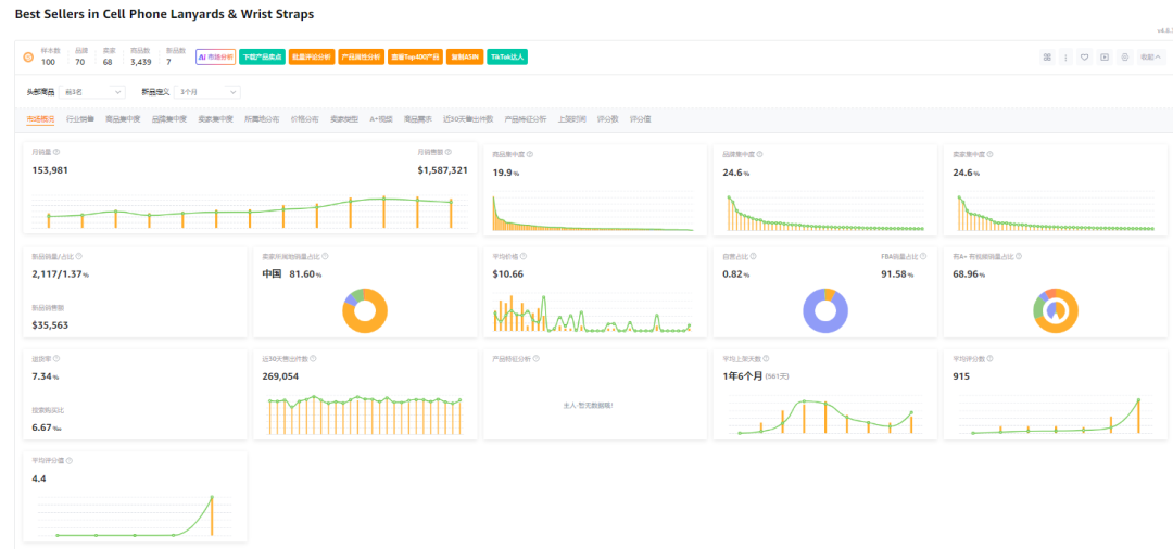 市场数据显示,100样本中新品有7个,新品销量占比1.37%,商品集中率19.9%,品牌集中度24.6%,卖家集中度24.6%,中国卖家占比81.6%,类目退货率7.34%。