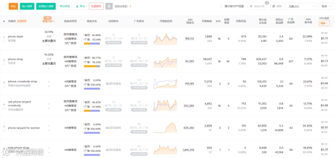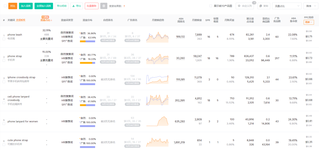 关键词反查结果显示,大部分流量词来源于自然流量。其中主要流量词phone leash的ppc竞价0.75美金,主要流量词phone strap的ppc竞价0.73,关键词iphone crossbody strap的ppc竞价0.66美金竞价,关键词cell phone lanyard crossbody的ppc竞价0.68美金。