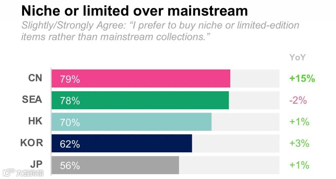 限量版及小众系列的销量正在超越主流系列,尤其是在中国,其销量同比增长了15个百分点。尽管老字号奢侈品牌依然保持着其影响力,但新的趋势反映出消费者对经典品牌的疲软以及对新鲜、差异化产品日益增长的需求。