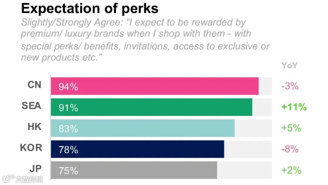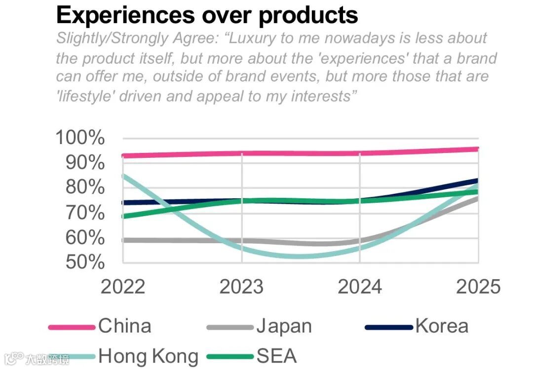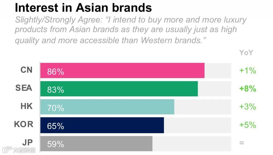 数据突显出,消费者对富有创新性、情感共鸣和文化相关性的品牌的需求日益增长,亚洲奢侈品牌尤其受到青睐,尤其是在中国(86%)、东南亚(83%)和香港(70%)。