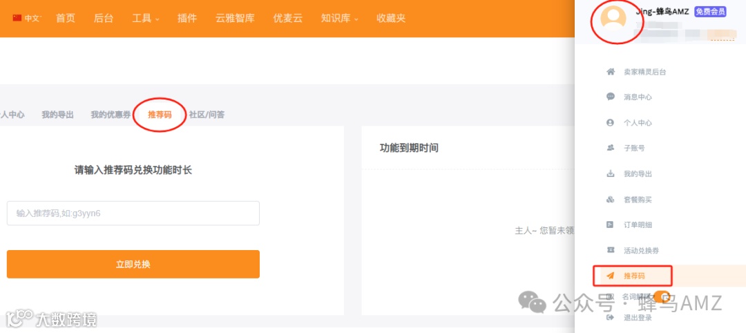 登陆账号点击头像打开【个人中心】,点击【推荐码】,跳转到兑换页面