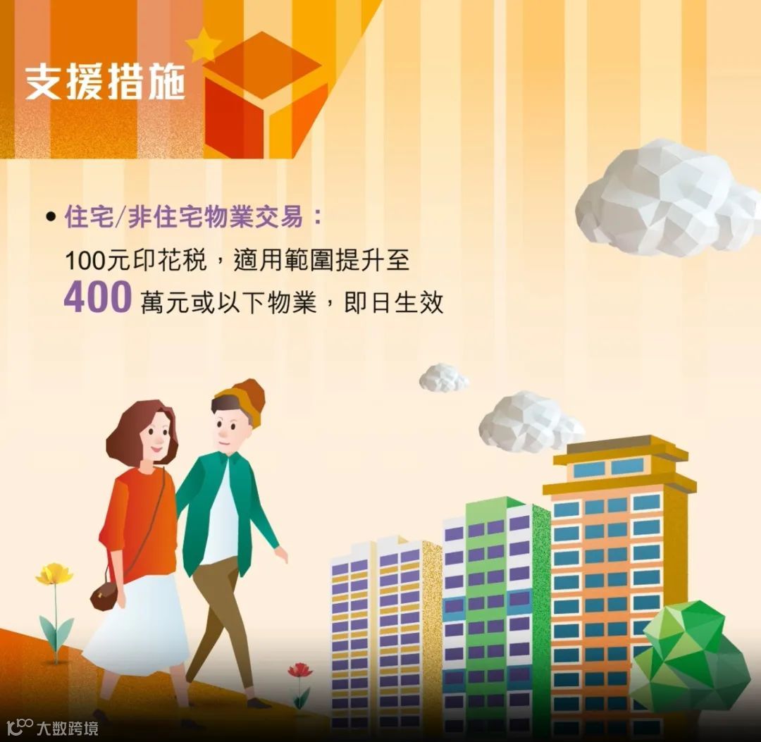 物业印花税门槛由300万元提升至400万元,即日生效,预计每年减少税收约4亿元,惠及约15%物业交易[k]。