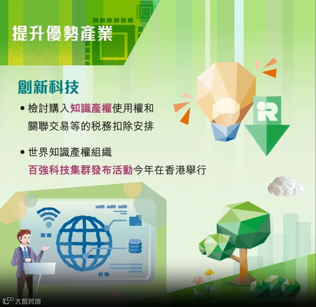 政府将检讨知识产权相关税务扣除安排,包括购入使用权的特许费用及向关联方购入知识产权的支出,以推动知识产权密集型产业发展[k]。