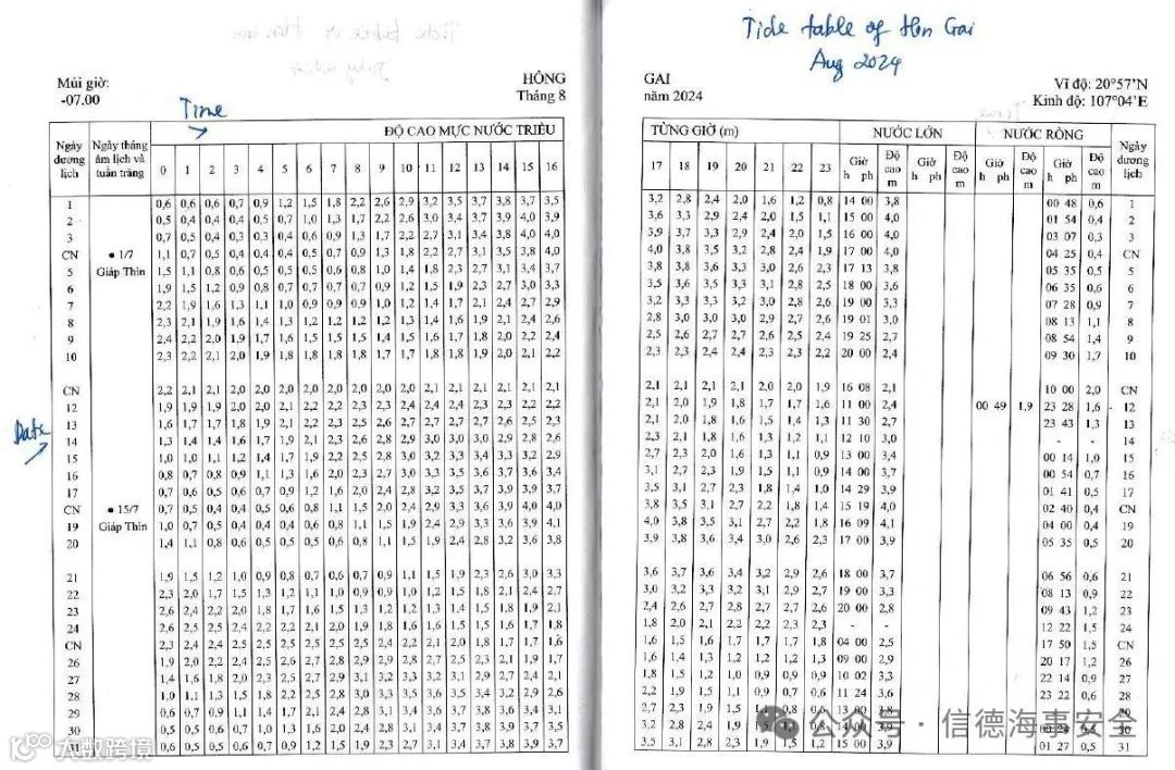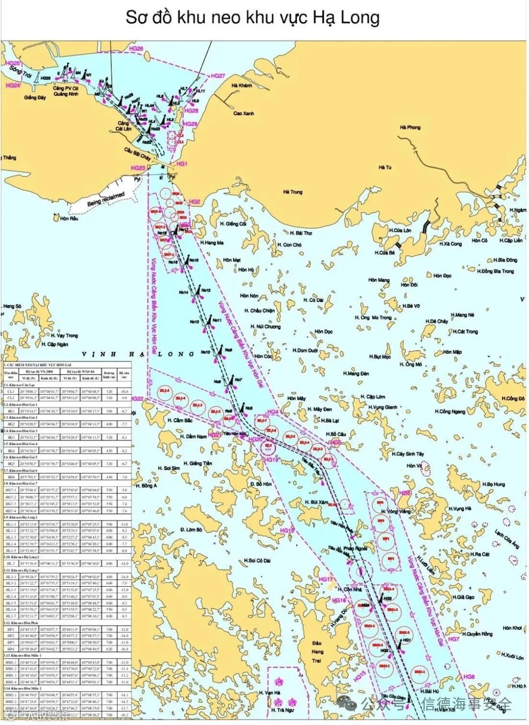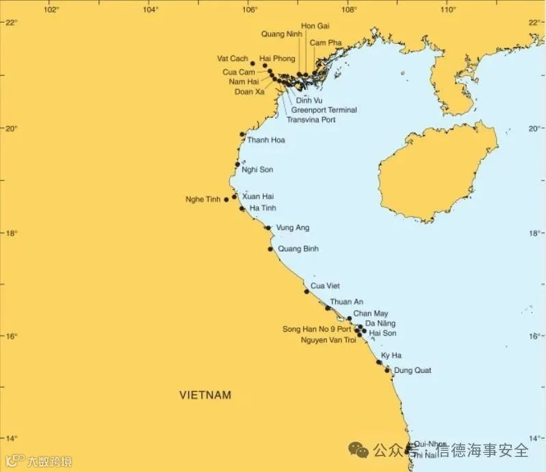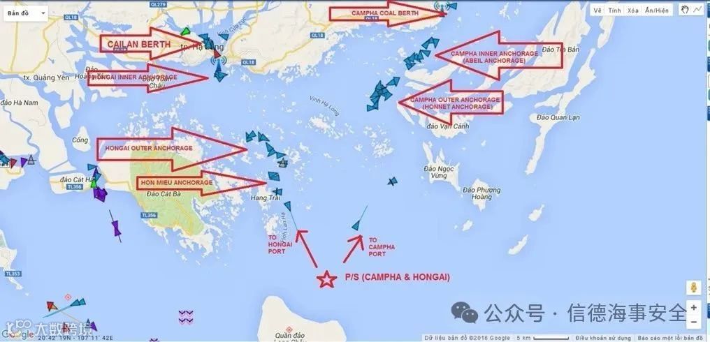 由于航道水深受限(零潮汐水深13米,要求UKC 1米),船舶通常需在Hang Trai岛以东的指定工作锚地进行卸货,并需等待高潮进入锚地作业[k]。