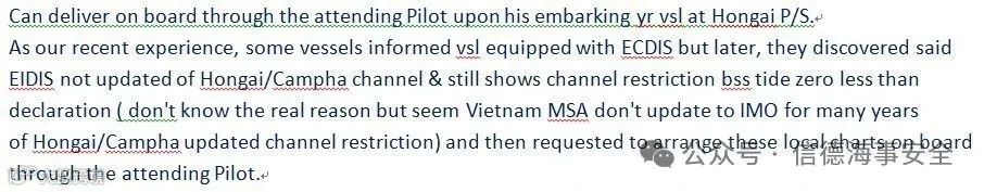 ⑤. 代理推荐当地海图 Hongai(VN50003 & VN50004),每张价格为120美元。需注意此类海图未及时更新,建议在邮件中明确标注:若发现未更新则退回。实际操作中,引水员登船后确认海图无更新,开航后已完成退货[k]。