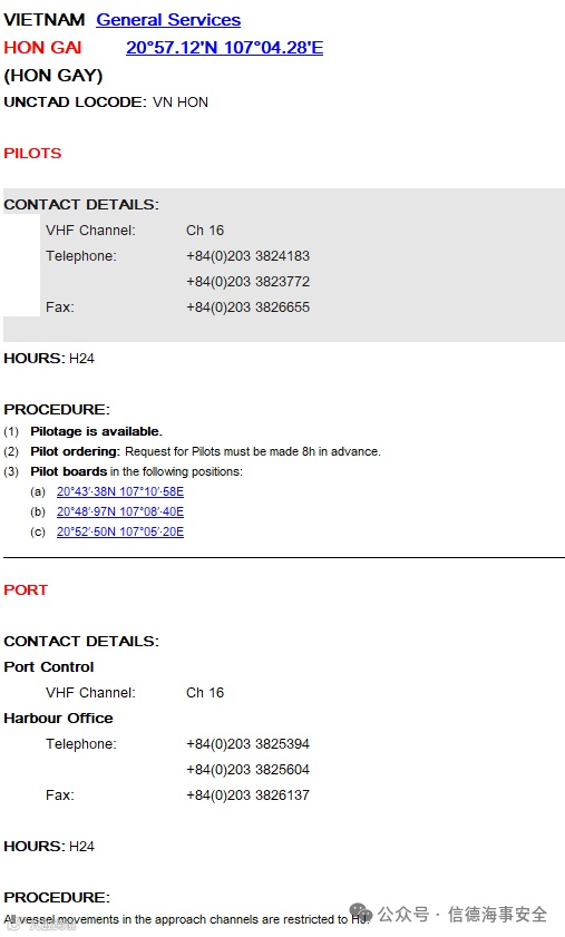 鸿基港引航站位于L’Orang岛南1海里处(Lat 20°43.3′N, Long 107°10.05′E),使用VHF CH16联系,时区为UTC+7,港口保安等级为Level One[k]。