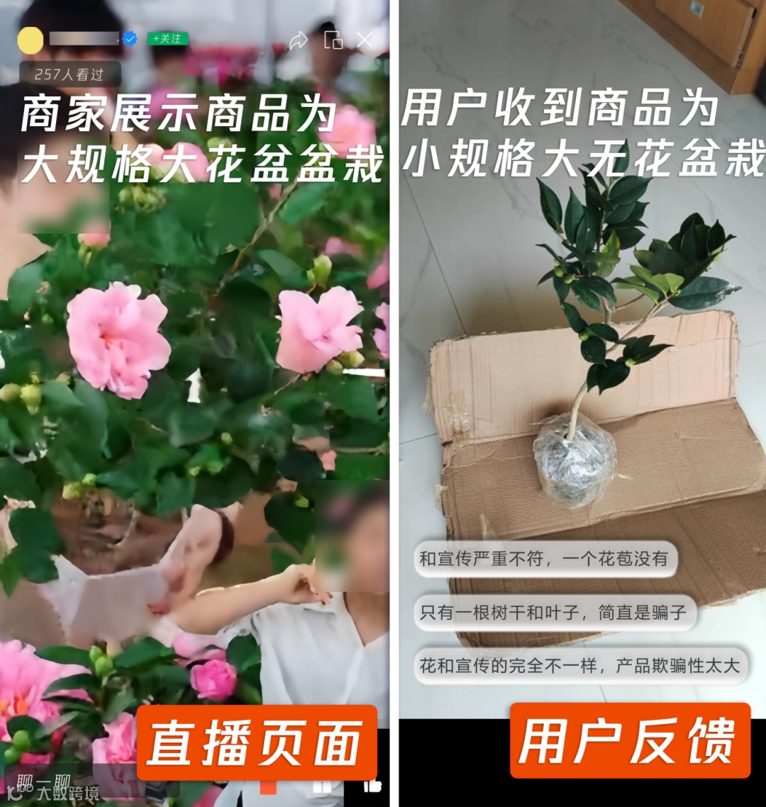 商家广告展示的是枝繁叶茂的成品盆栽,但用户实际收到的仅是处于培育初期的花苗。由于最终成长效果无法保证,导致用户认为受到误导并投诉。
