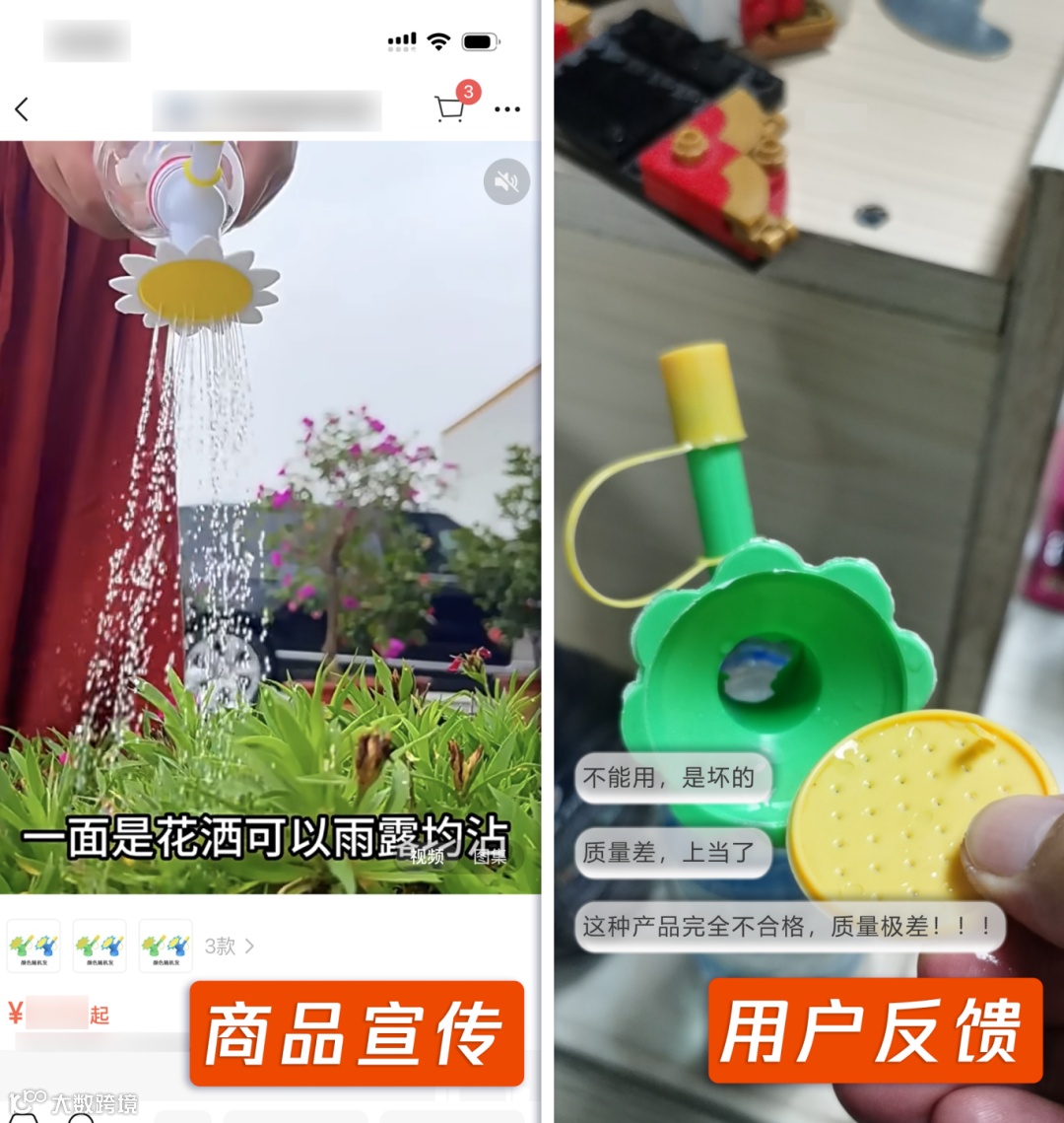 商家在广告中宣传的花洒在用户到手后发现商品存在毛边、做工极其粗糙,质量远不及用户购买预期。