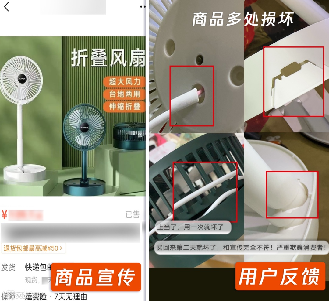商家在广告中展示了一款完好无损的折叠电风扇,但用户收到的商品却存在多处破损,实物质量极差,存在「商品品质」问题,极大损害了用户消费体验与利益。