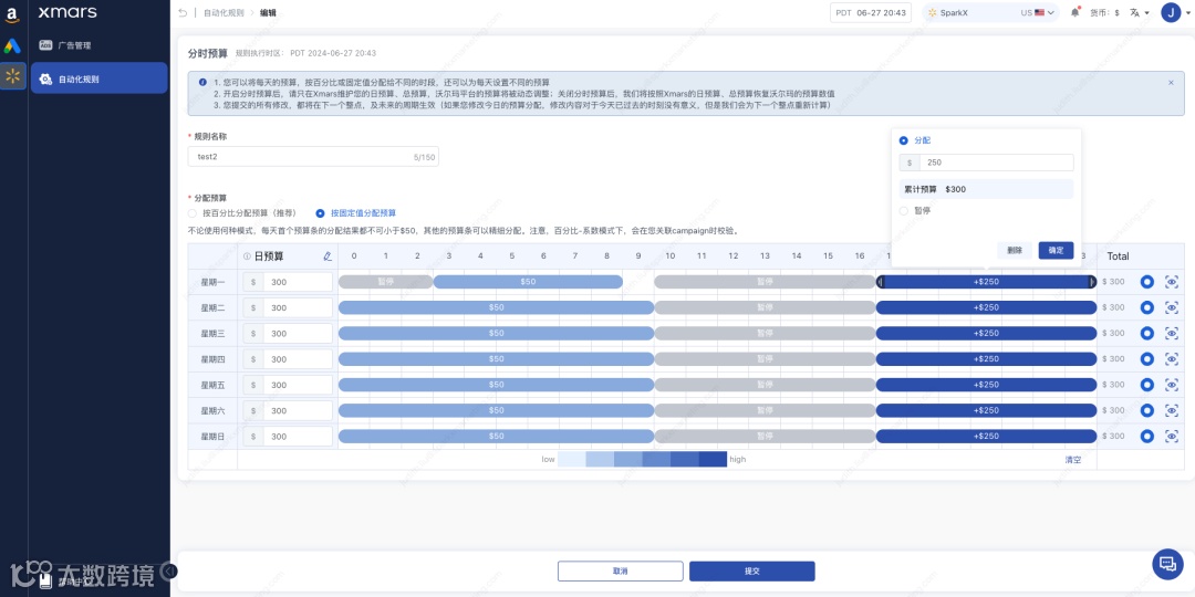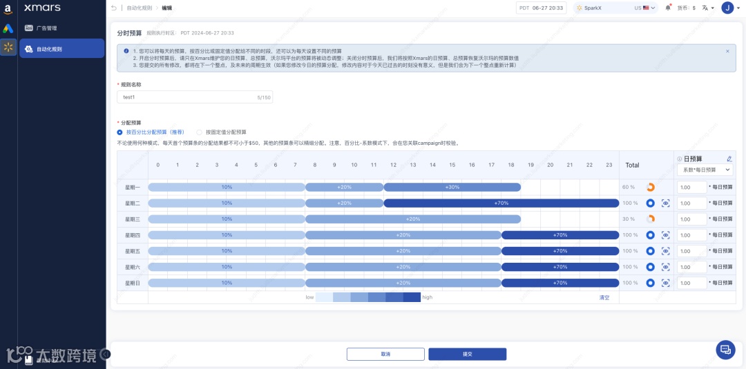 Xmars分时预算功能支持将每日预算按时间段分配,并可为周一至周日设置不同日预算[[k]]。在促销或购物高峰期自动增加预算,提升曝光与销量;平日则减少投入,避免浪费[[k]]。