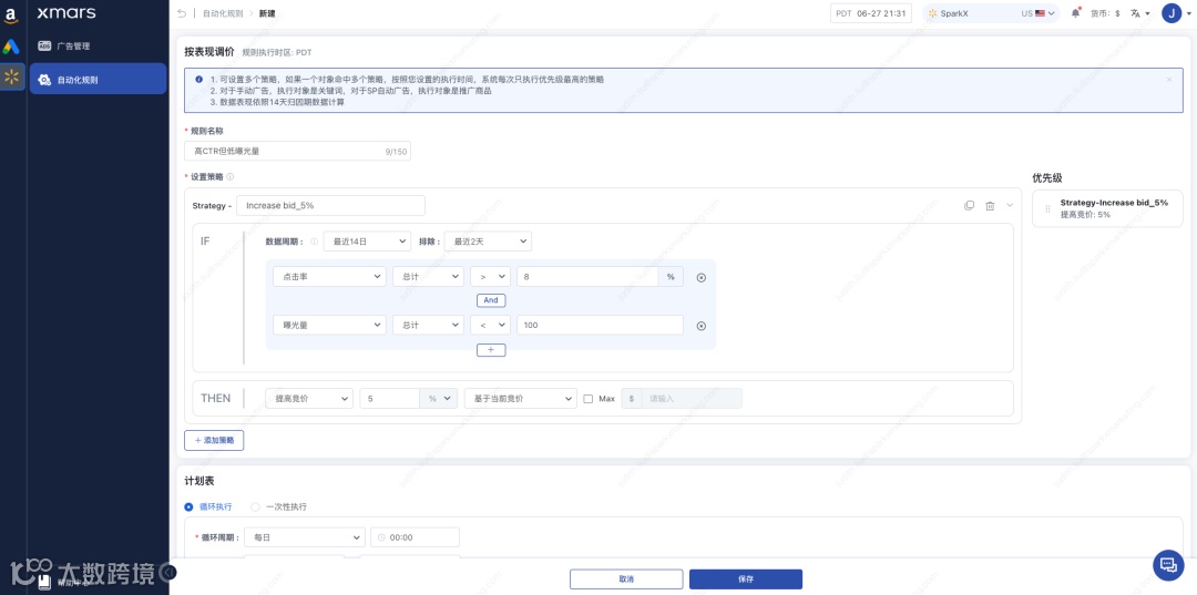 通过「沃尔玛广告自动化规则」,Xmars以分时调价、分时预算和按表现调价三大功能,全面支持卖家制定差异化广告策略[[k]]。显著提升运营效率,实现多渠道广告的精细化管理与高效投放[[k]]。