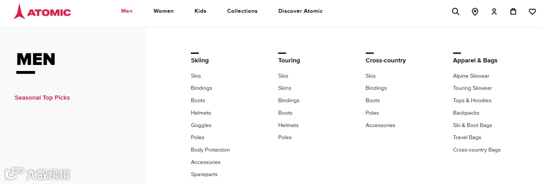 Atomic独立站以简洁大方的网页布局,让用户清晰明确购物方向,便捷购买。Shoptop观察发现,Atomic网站导航按男性、女性、儿童设置产品分类购买,精细化划分滑雪用具及配件。