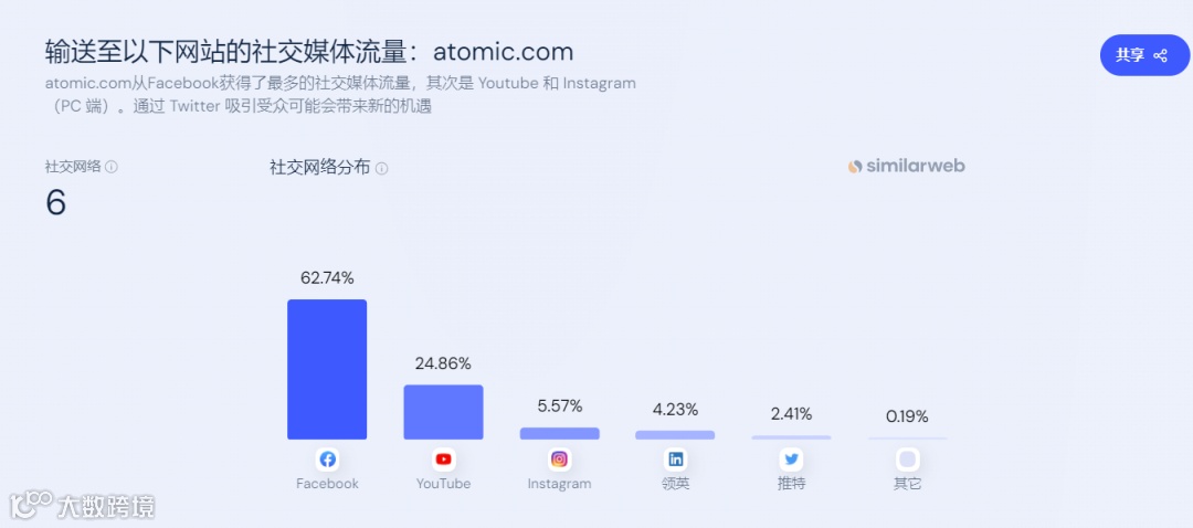 similarweb数据显示,Atomic流量有62.74%来自于Facebook、24.86%来自于YouTube、5.57%来自于Instagram。