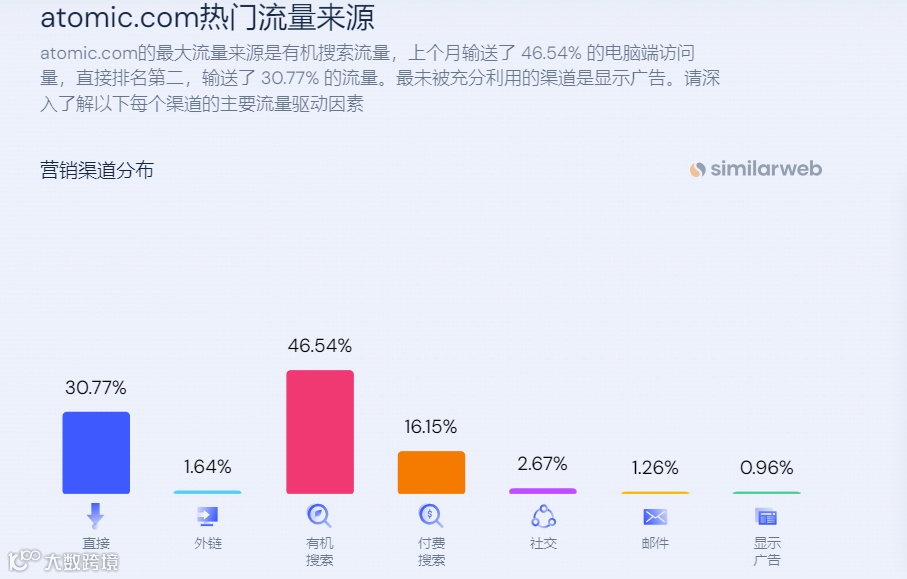 Shoptop观察到,Atomic最大流量来源于有机搜索(46.54%),其次是直接搜索(30.77%)、付费搜索(16.15%),有机搜索、直接搜索占比突出,自然流量效果十分不错。