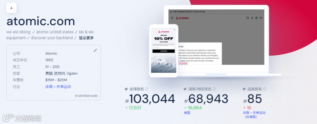 根据similarweb数据显示,Atomic年营收1500万美元——2500万美元之间,11月Atomic独立站月访问量达42.28万次,其中美国、德国、奥地利、法国、加拿大等国占据网站访问主要份额。