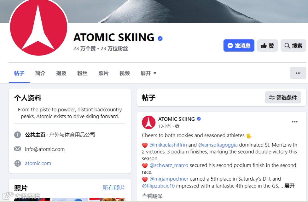 Atomic在Facebook上拥有23万粉丝,品牌账号主要宣发新产品、赞助运动员/赛事获奖消息,主页内设置邮箱和官网外链,可帮助感兴趣用户快速了解。