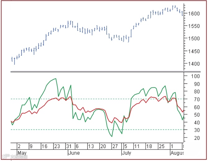 对于下跌收盘平均线或当实际条形图的收盘价低于前一条形图(以正值表示)时,也采用同样的方法。这意味着平均周期与 RSI 周期中的上涨或下跌条数无关。RSI 被转换为振荡器,其值介于 0 和 100 之间:
