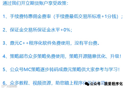3、使用我们自研平台“鼎元C++全自动化”平台进行期货量化交易,执行期货公司特惠佣金费率,享受免平台费服务,【执行无平台费,不加手续费政策】,众多策略模板范例可供参考、优化与升级。我们还提供更多的教程服务与视频培训,欢迎咨询。