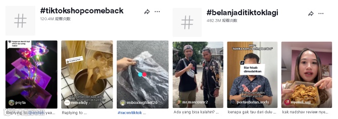 在 TikTok 印尼小店回归后,大批受影响的卖家、带货主播和消费者纷纷在 TikTok 上自发为其庆祝,截至目前,TikTok 上关于回归的话题标签 #tiktokshopcomeback 已有超 1.2 亿次的观看次数,在视频中可以明显感觉到他们内心的激动和雀跃。不仅如此,另一标签 #belanjaditiktoklagi(又在 TikTok 购物了)同样也在 TikTok 上引发网友热议,目前话题也有接近 5 亿次的浏览量。