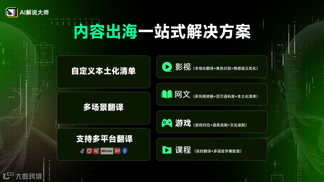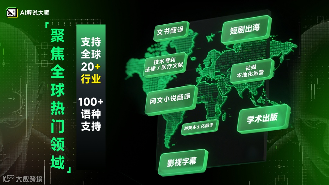先进的AI技术,必须在真实的商业场景中创造价值。AI解说大师聚焦全球热门领域,为短剧、网文、游戏、课程、跨境营销等20+行业,提供的一站式AI出海解决方案。
