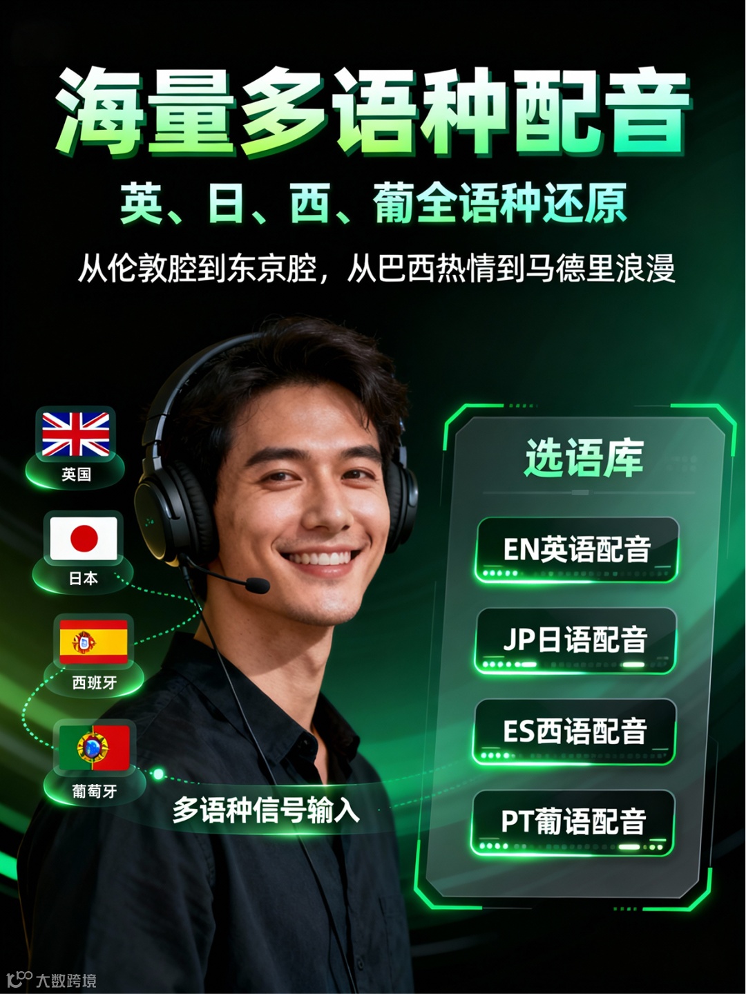 从标准的伦敦腔到热情的巴西葡语,从冷酷的东京腔到浪漫的马德里西语,让你的解说“声”临其境,彻底征服观众的耳朵。
