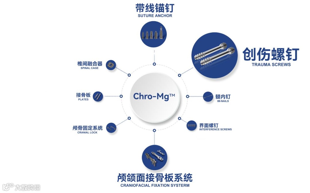 公司产品以骨科医疗器械为起点,产品管线覆盖创伤骨科、运动医学、整形外科等多个领域。正在开发的创新三类医疗器械产品包括镁合金接骨螺钉、镁合金带线锚钉、镁合金颅颌面微钉板系统等。
