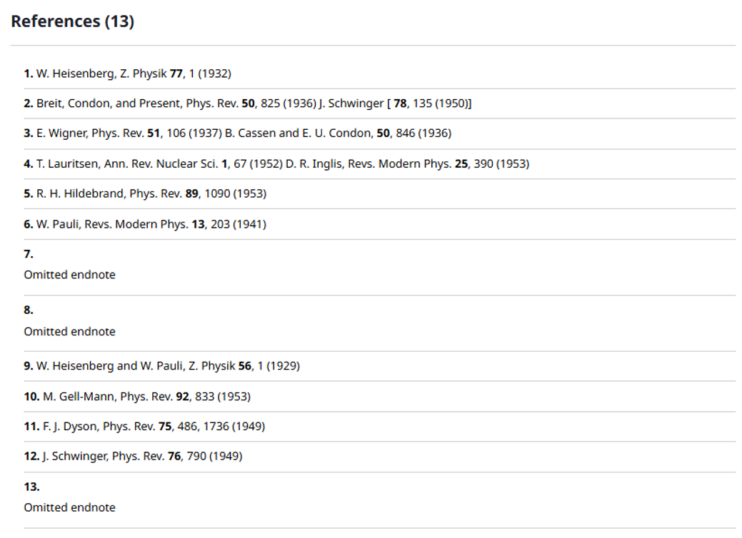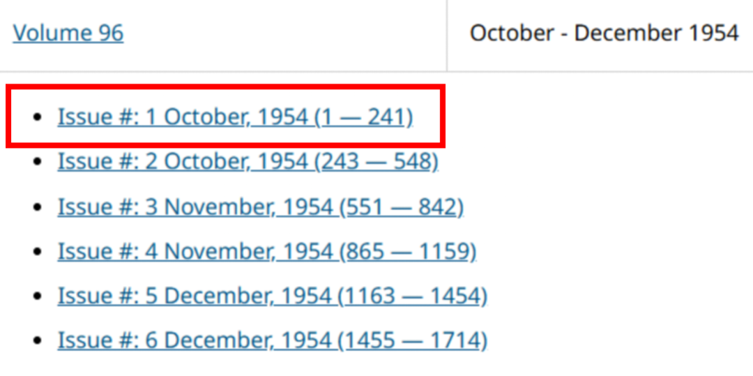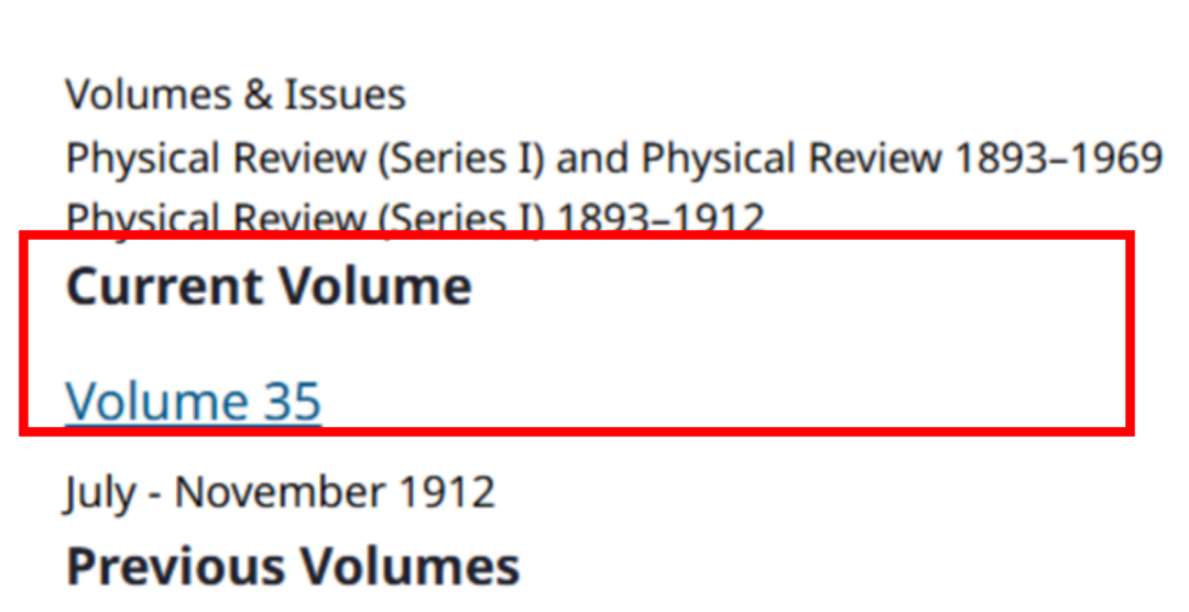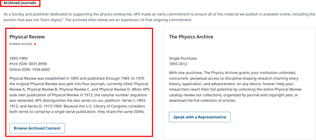 例如,在上述范例二中,已知“Phys.Rev. 96,191 (1954)”信息,那么我们就可以先找到Phys.Rev.期刊,点击“Browse Archived Content”,浏览1893年-1969年期间的文献信息,找到对应的出版年、卷期、页码,即可获取目标文献。