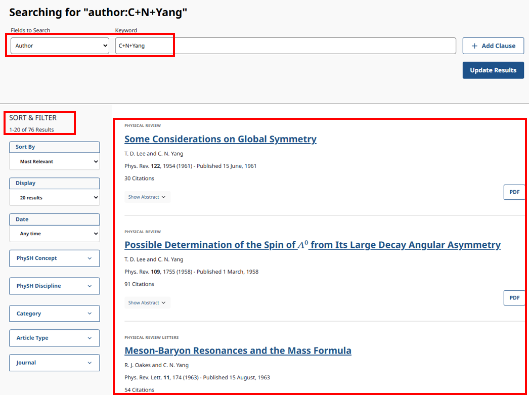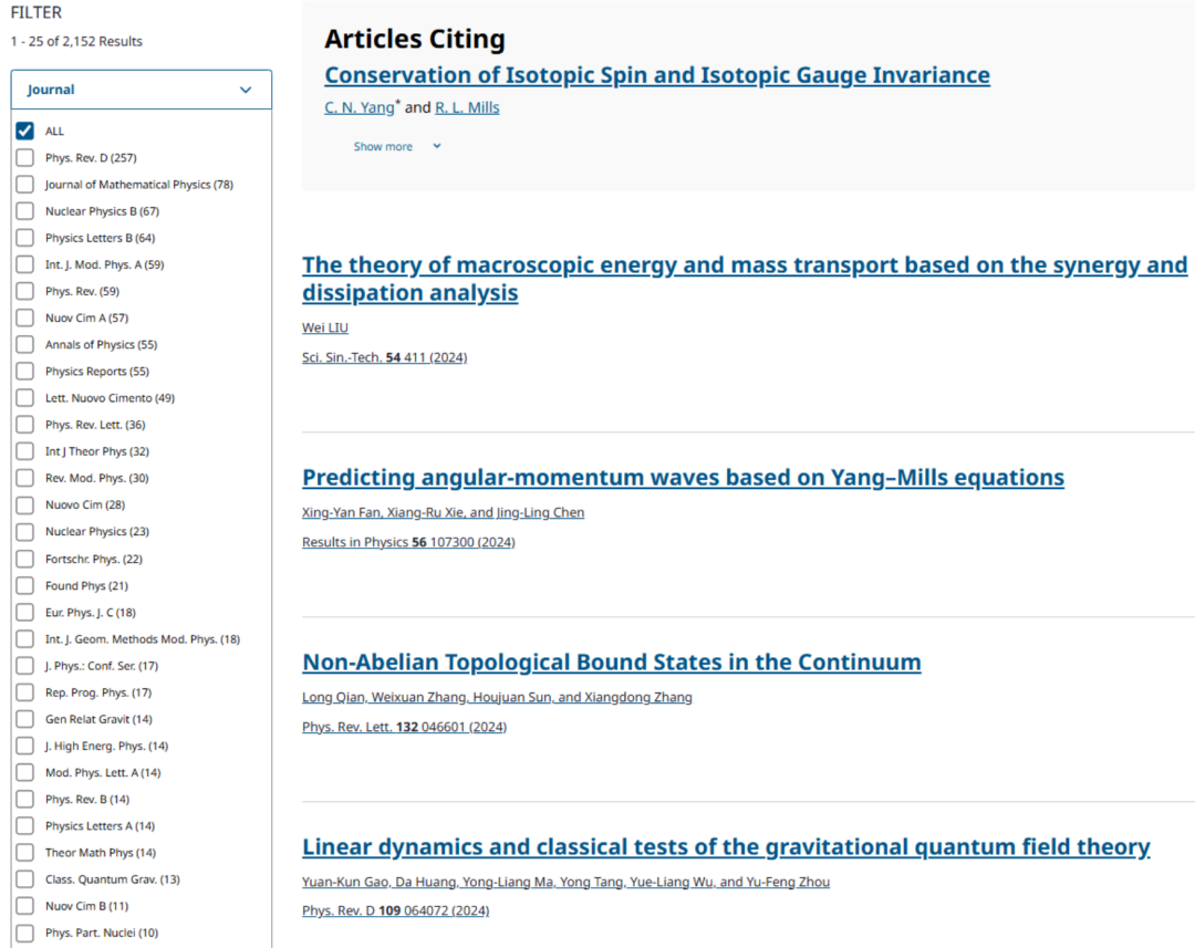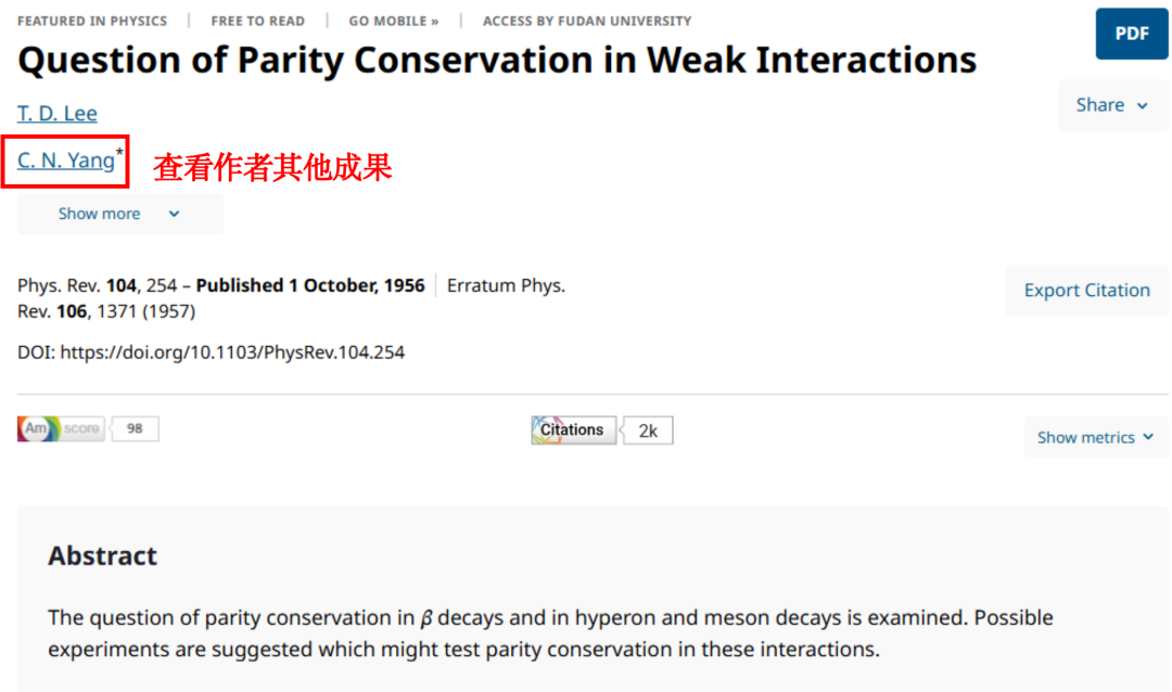 如果想进一步查找杨振宁先生的其他论文,可点击文章标题进入详情页,点击作者名称"C. N. Yang"。