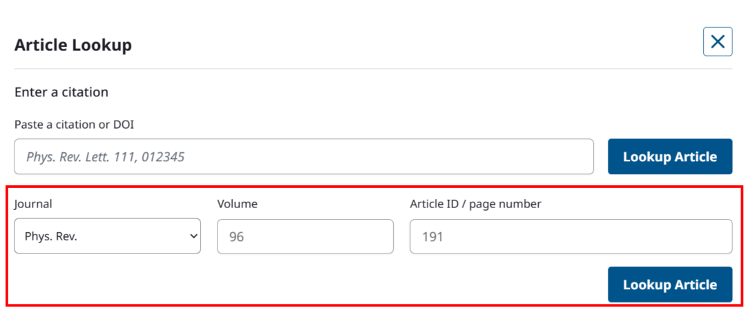 例如,在上述范例二中,已知“Phys.Rev. 96,191”信息,那么我们可以直接点击APS主页右上方点击“Article Lookup”,输入期刊名、卷号、页码,即可快速定位到目标论文。
