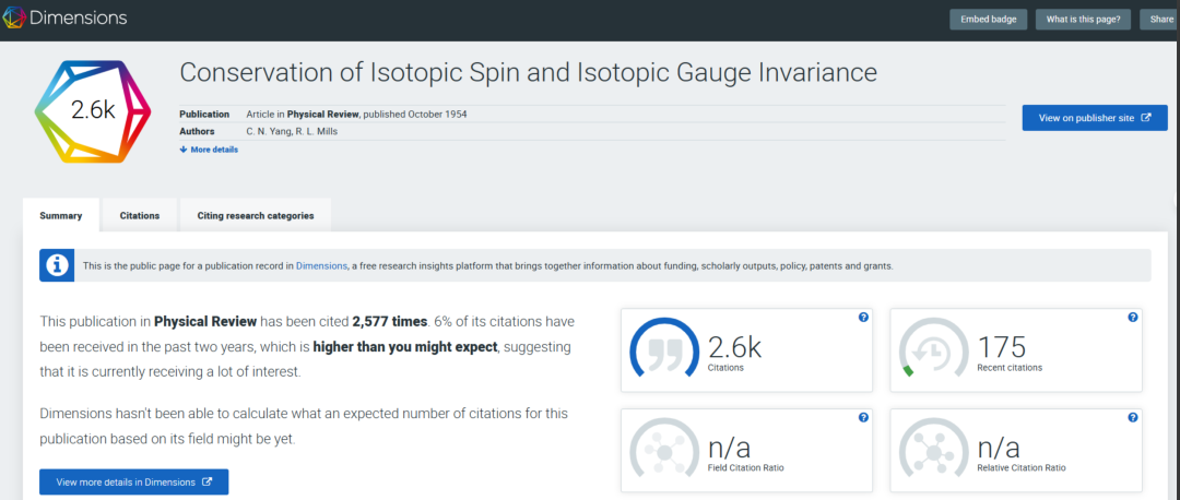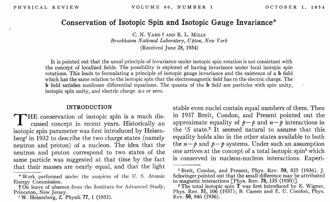 范例二:杨振宁先生与米尔斯提出的“杨-米尔斯规范场论”奠定了后来粒子物理标准模型的基础,被认为是现代物理学的基石之一,是与麦克斯韦方程和爱因斯坦广义相对论相媲美的最重要的基础物理理论之一。